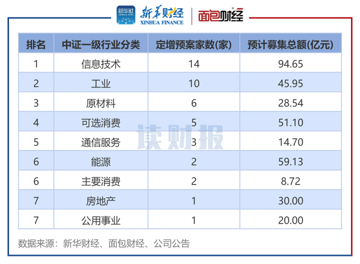 从行业分布来看,以中证行业统计,2025年8月,信息技术行业发布14起定增预案,拟募资额合计超94.65亿元,数量和金额均排在各行业之首;其次是工业行业,有10起定增预案;原材料行业排名第三,有6起定增预案。