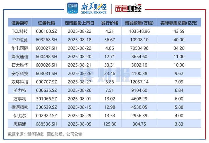 2025年8月实施定增的上市公司中,TCL科技的实际募资额排在首位。TCL科技拟向深圳市重大产业发展一期基金有限公司发行股份及支付现金购买重大产业基金持有的深圳华星半导体21.5311%股权。TCL科技本次发行股份募集配套资金新增股份数量为10.35亿股,发行价格为4.21元/股,实际募资总额为43.59亿元,募集资金净额拟用于支付本次交易的现金对价。
