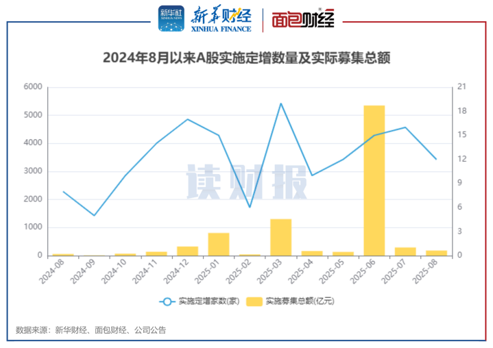新华财经北京9月2日电统计显示,2025年8月,A股上市公司共计实施定增12起,同比上升50%;实际募资总额约182.13亿元,同比上升209%。