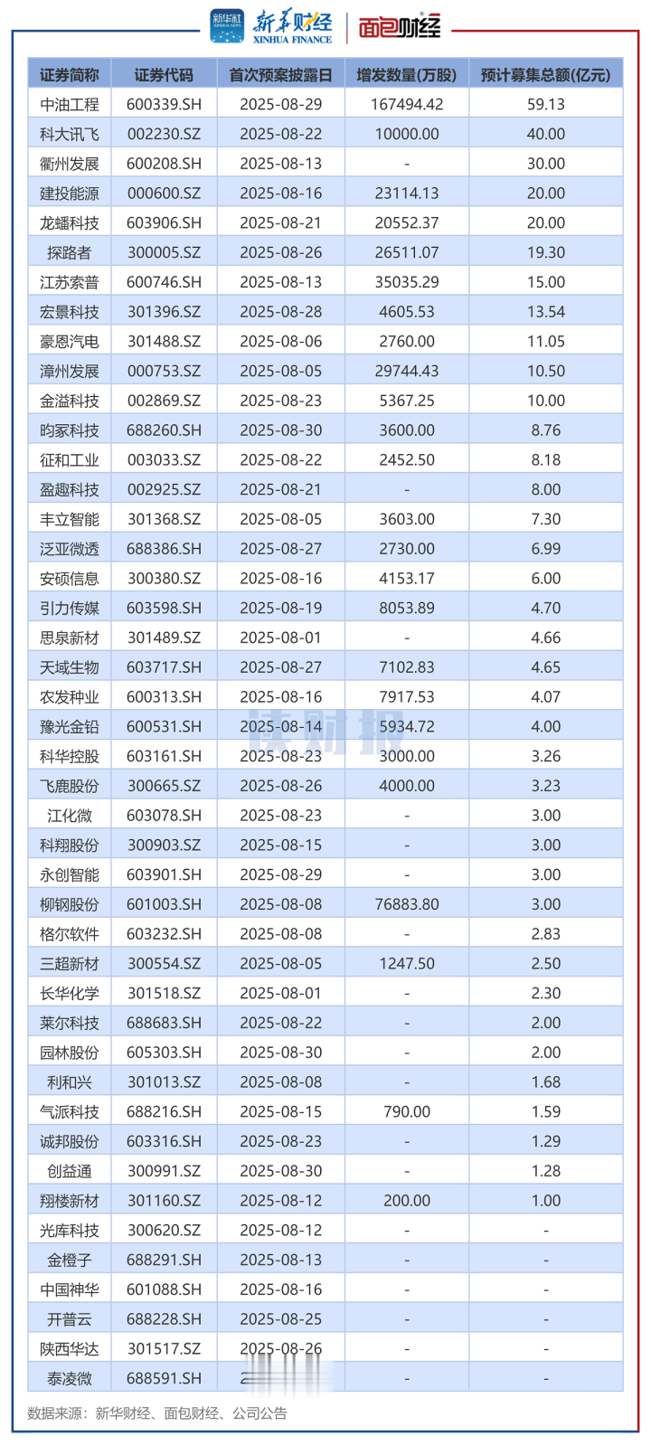 按照首次披露预案日口径统计,2025年8月A股上市公司定增预案发布数量共计44起,拟募资规模约352.78亿元,同比上升112%。其中,中油工程、科大讯飞等企业拟募资规模相对靠前。