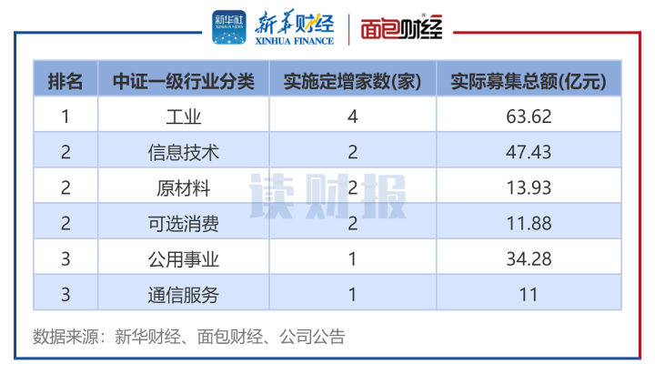 从行业分布来看,以中证行业统计,工业行业实施4起定增,募资规模合计约63.62亿元,数量和金额均排在各行业之首;其次是信息技术、原材料、可选消费行业,各有2起定增实施。